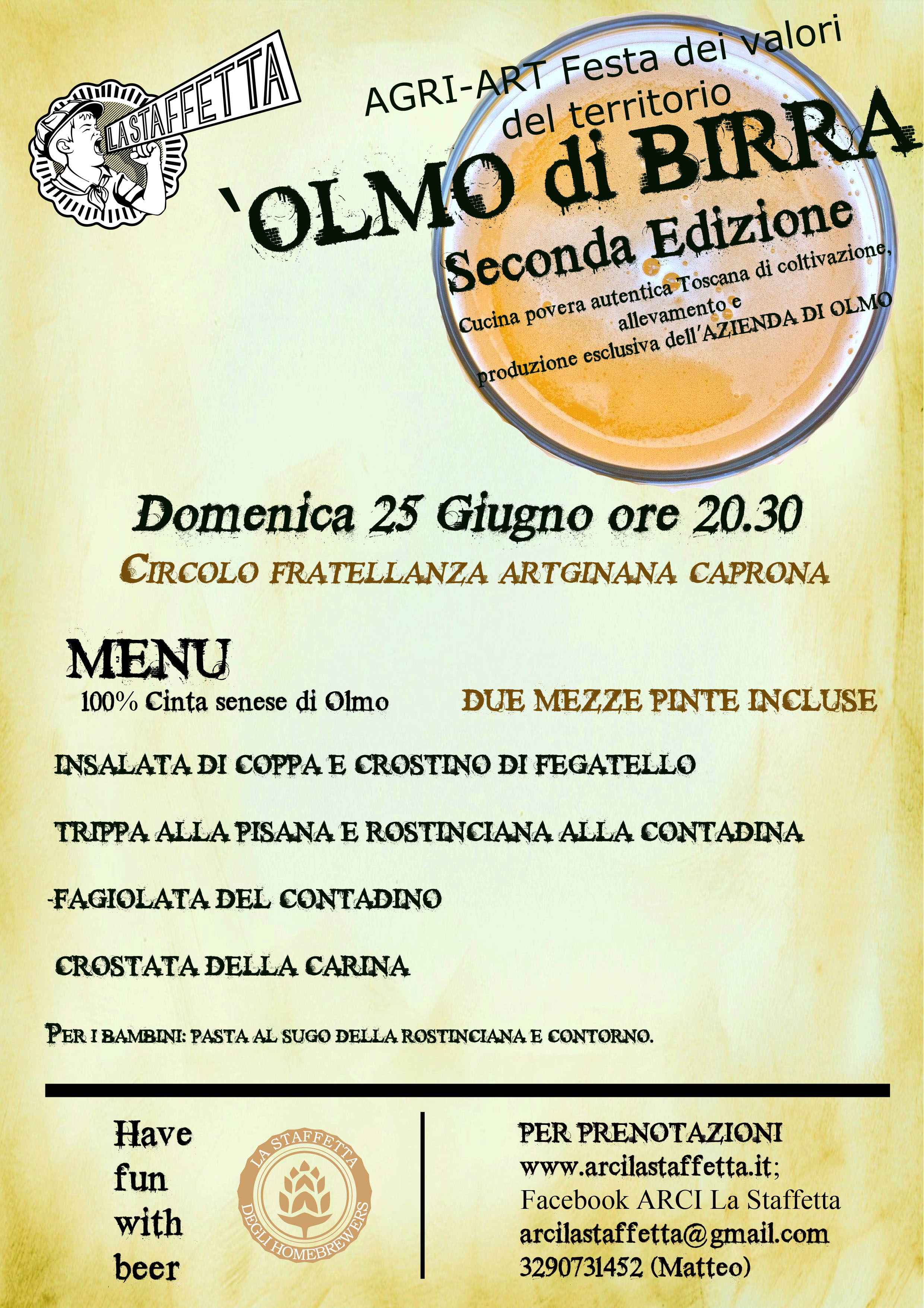 Domenica 25 Giugno La Staffetta in collaborazione con il Circolo Fratellanza Artigiana di Caprona (Vicopisano) e con il patrocinio del Comune di Vicopisano organizza una giornata all’insegna di escursioni (La manifestazione avrà inizio per le 19 con un escursione alla torre di Caprona, dove all’ora del tramonto verranno messe in scena performance teatrali costruite attorno a letture di Dante e resoconti di storici del luogo), aggregazione, scoperta dell’artigianato, artisti di strada, musica live e ovviamente la cena a base di cinta senese e birra artigianale made in Staffetta, in poche parole ‘OLMO DI BIRRA, ecco il menù:
