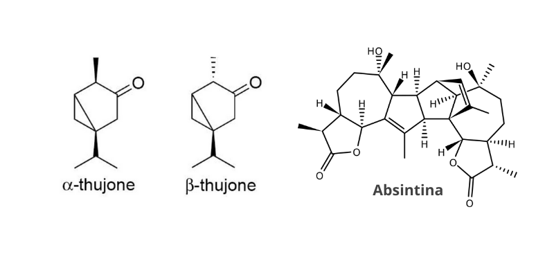 Il tujone è un monoterpene biciclico chetonico presente in due stereoisomeri, l’α-tujone ed il β-tujone generalmente indicato per fini legislativi come somma dei due (Lachenmeier, 2010). Non meno importante dobbiamo segnalare l’absintina, in quanta responsabile del sapore amaro della pianta, o del distillato d’assenzio. Per questo motivo non si può semplicemente macerare il prodotto perché risulterebbe eccessivamente amaro e non bevibile. Esso è il responsabile di sensazioni simili all’assunzione di cannabinoidi, come il THC per esempio. L’effetto complessivo che ne deriva è talvolta descritto come un’ebbrezza lucida, con una forma di sedazione antidolorifica.