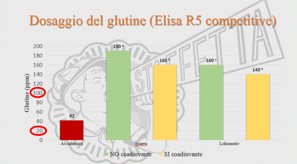 Infine, sono stati effettuati dei test volti a determinare l’effettiva quantità di glutine presente nelle tre ricette valutandone, come nel caso delle molecole ad attività antiossidante, il grado di variazione in funzione dei dei differenti approcci tecnologici impiegati, nell’ottica futura di comprensione dei metodi più idonei da adottare per l’ottenimento di un prodotto a basso contenuto o privo di glutine partendo tuttavia dalle materie prime classiche.